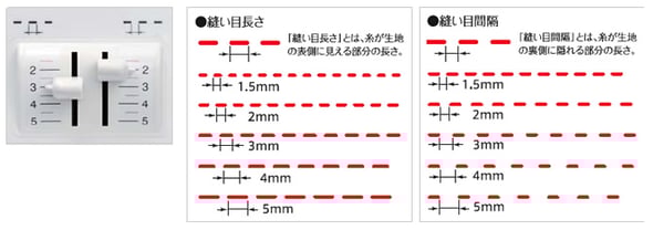 「縫い目長さ」と「縫い目間隔」は1.5mm~5mmの範囲で調整可能。縫いパターンやお好みに合わせて変更してください。